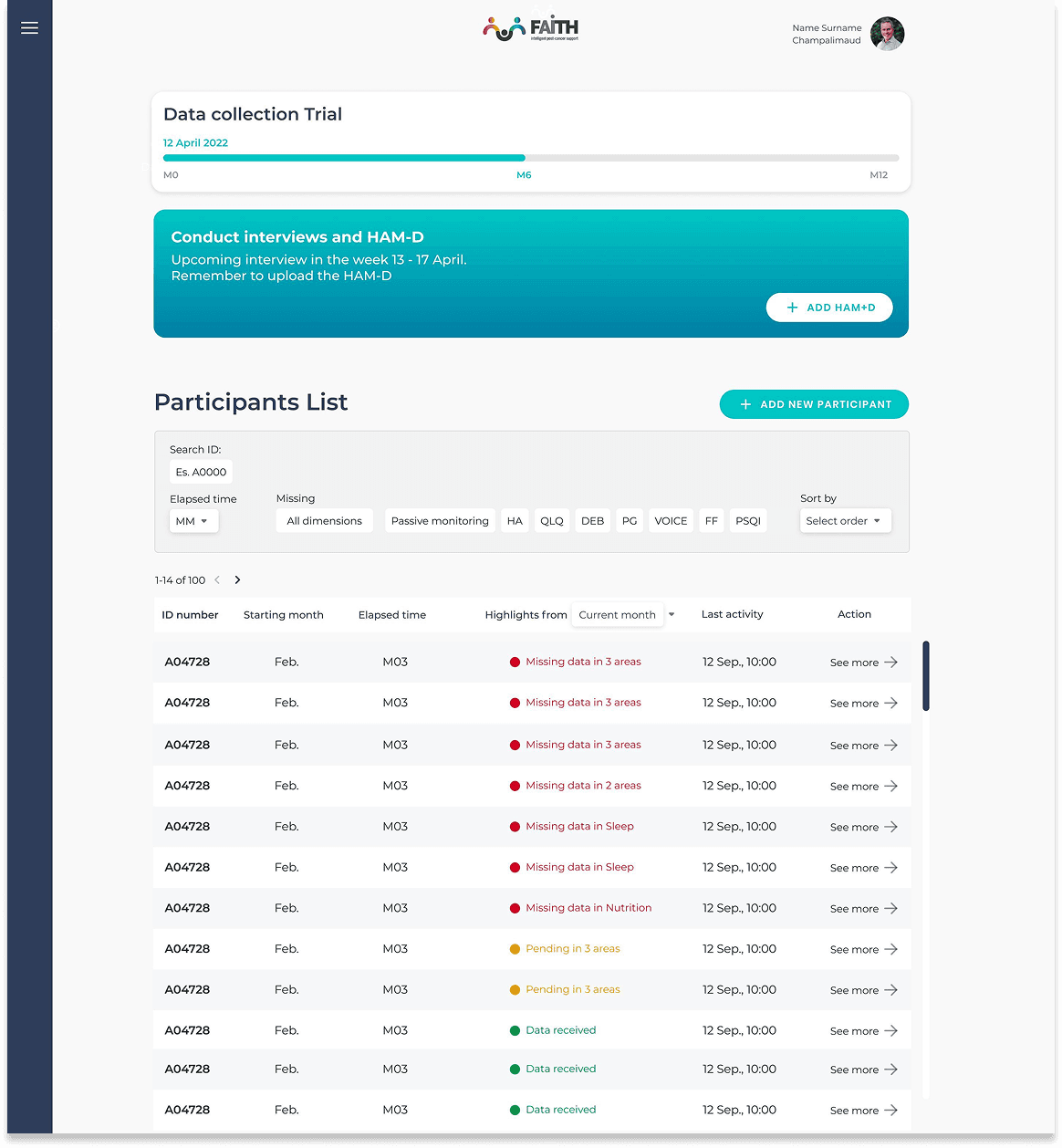 One year later, the Faith App was developed and ready to be used in trial. In order to have data coming in, we realized we were in need of a customized web dashboard that data analysts and clinicials could use to monitor the data collection. Several factors could have hindert this crucial part ( For example: participants not providing the data or dropping the trial, usability challenges, system bugs). Clinicians needs to be able to quickly spot which participants are not providing data in order to contact them and understand their reasons.